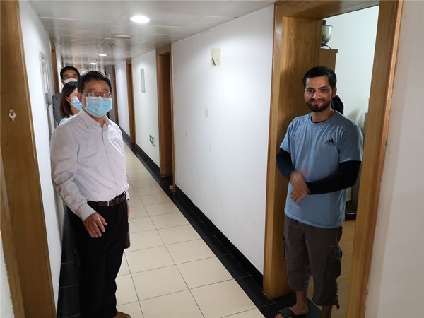 学院领导全面细致地了解了国际学生公寓疫情防控及安全管理工作情况,并走访了部分学生宿舍,与学生亲切交谈,了解他们的学习和生活情况,重点就学生关心的问题和提出的困难进行了交流和回应。