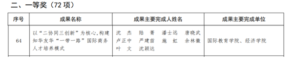 由国际教育学院和经济学院联合申报的教育教学项目《以“二协同三创新”为核心,构建知华友华“一带一路”国际商务人才培养模式》荣获一等奖。这是学院首次参加全校教学成果奖的评选,也是国际学生人才培养获得的首个教学成果奖。今后,学院将进一步深化教育教学创新与改革,加强研究和总结,全力推动国际学生教育内涵式发展。