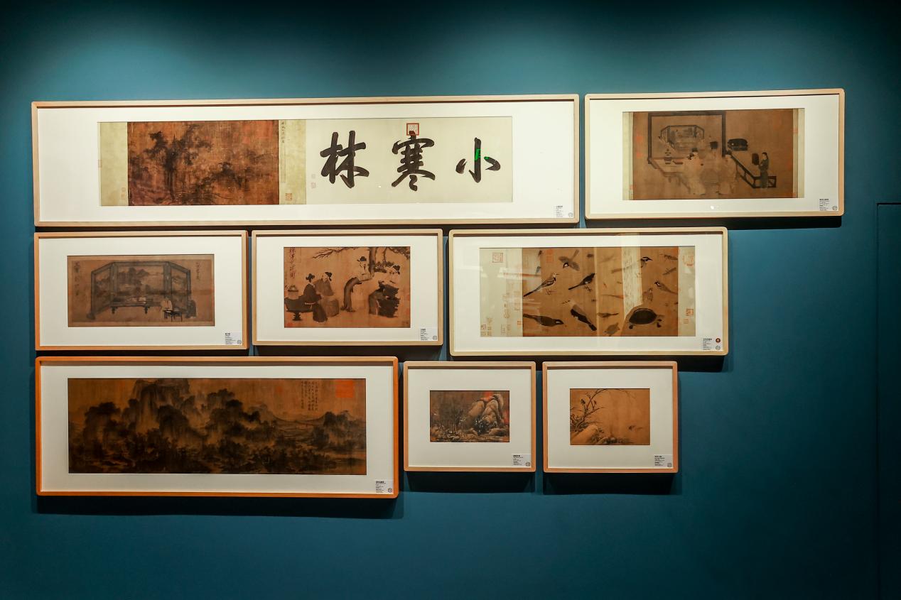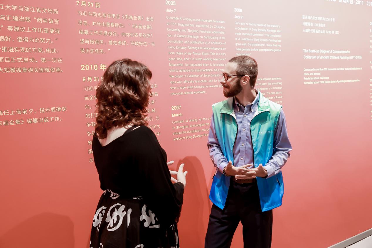 随着讲解员的娓娓道来,整个典藏馆正如一幅巨大的画卷在同学们面前徐徐展开:以“宋画”为题,展览分为三个部分,“薪火相传 代代守护”,介绍了“中国历代绘画大系”项目的发展历程;“宋韵千载 文脉流芳”,展示了五代、宋、辽、金时期共计千余件国宝级的宋代绘画高清打样稿;在“创新转化 无界之境”中,大家可以深入感受新媒体技术和中国传统艺术的融合创新。此外,为了迎接第三届良渚论坛的召开,馆内还推出了“大音希声——宋代绘画中的音乐”专题展。