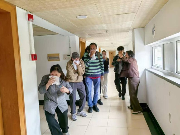 下午2点25分,演习模拟真实火情启动。随着消防烟雾弹被点燃,应急广播随即拉响。参与师生迅速反应,在疏散引导员的指挥下,用湿毛巾捂住口鼻,低姿弯腰,严格沿预定路线快速、有序撤离至安全区域。整个过程紧张高效,井然有序。