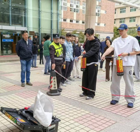 疏散结束后,保卫处虞波老师对演习情况作了现场点评,并详细讲解和演示了灭火器的正确使用方法。在随后的实操环节中,陈伟英副院长与国际学生共同体验了电子虚拟灭火器的操作,进一步巩固了消防知识,提升了实战应对能力。